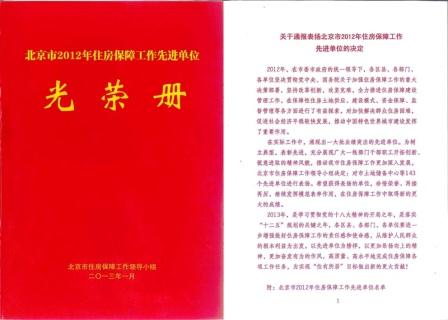 1.2013年1月 獲得北京市2012年住房保障先進(jìn)單位 2.2012年11月17日,中國房地產(chǎn)行業(yè)協(xié)會授予北京廣安置業(yè)投資公司“2012年度中國房地產(chǎn)開發(fā)綜合實力100強(qiáng)”、“2012年度全國保障房建設(shè)優(yōu)秀開發(fā)企業(yè)”兩項榮譽(yù)稱號。